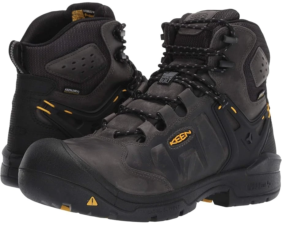 The KEEN® Utility 6″ Dover WP carbon-toe work boot lets you stand for hours, climb ladders, and work in unpredictable work environments, while keeping you steady, supported and protected all workday long. SKU: #9268428Style numbers: 1021467 (Dark Earth/Black) and 1021469 (Magnet/Black).Lightweight non-metallic carbon-fiber safety toe work boot meets ASTM F2412-17 and F2413-17 M I/75 C/75, EH (Electrical Hazard) safety standards.Waterproof leather, synthetic, and mesh upper.Carbon safety toe work boot is AMERICAN BUILT with materials from around the world.KEEN.DRY® waterproof breathable membrane locks out rain and humidity, but releases the heat and perspiration created throughout a hard day’s work.Treated with Cleansport NXT™ technology to fight odors and provide a fresher foot environment.Left and right asymmetrical safety toe caps provide a roomier toe box and maximum comfort. Traditional lace-up design with dual-purpose metal lace hooks for a secure fit. Moisture-wicking textile lining allows for more interior breathability. Removable metatomical PU footbed provides long-lasting underfoot support and comfort. KONNECTFIT Heel-Capture System provides a locked-in fit for added stability. KEEN LUFTCELL dual-density PU midsole is infused with air for lightweight comfort, providing superior stability and shock absorption.KEEN.KEY TECH FLEX provides contoured underfoot support for added comfort and stability. TPU shank for midfoot support. 90º heel for better stability, particularly on ladders.Non-marking rubber outsole is slip- and oil-resistant that meets ASTM F1677-96 MARK II and ASTM F2913-17 SATRA Non-Slip Testing Standards. Made in the U.S.A. with imported materials.Product measurements were taken using size 9, width D – Medium. Please note that measurements may vary by size.Weight of footwear is based on a single item, not a pair.Measurements: