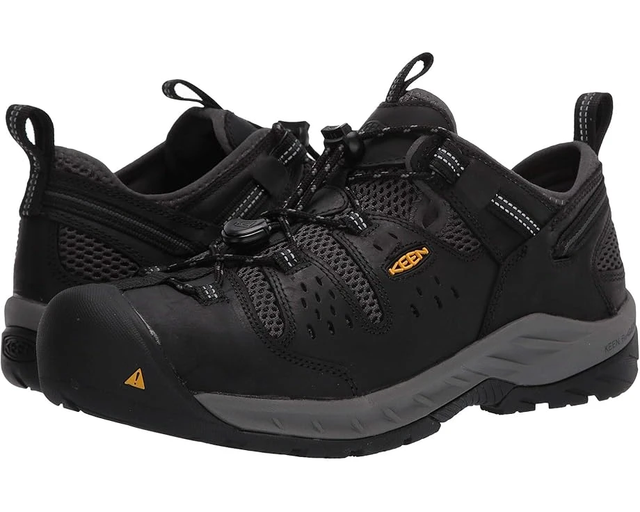 The KEEN® Utility Atlanta Cool II (Steel Toe) work shoes have a non-mutilating upper that reduces the chance of marking or scratching surfaces that makes them ideal for light-duty work environments.SKU: #9337629Style numbers: 1023216 (Black/Dark Shadow) and 1023215 (Shitake/Rust).Low-profile work shoes with left and right asymmetrical steel safety toes that meet ASTM F2412-11 and F2413-11 I/75 C/75, EH (electrical hazard) safety standards.Leather and mesh upper with reflective webbing for additional safety and visibility.Lace-up style. Shellback heel support.Heel pull loop for assisted entry.Plush tongue and collar for added comfort. Moisture-wicking textile lining for a drier, more breathable foot environment.