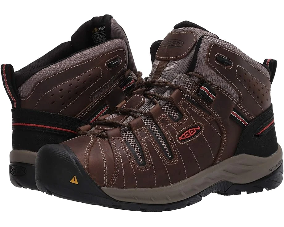 The KEEN® Flint II Mid Soft Toe work shoes are an updated style with a water-resistant leather and mesh upper, KEEN.ReGEN cushioning for long-lasting support, and a slip-resistant outsole for superior stability. SKU: #9337614Style number: 1023242 (Cascade Brown/Burnt Ochre).Mid-profile non-safety work shoes with left and right asymmetrical KEEN.PROTECT soft toes that meets ASTM F2892-17 EH (Electrical Hazard) Standards. Features reflective webbing for additional safety and visibility.Lace-up style. Shellback heel support.Heel pull loop for assisted entry.Plush tongue and collar for added comfort. Mesh and moisture-wicking textile linings for a drier, more breathable foot environment.