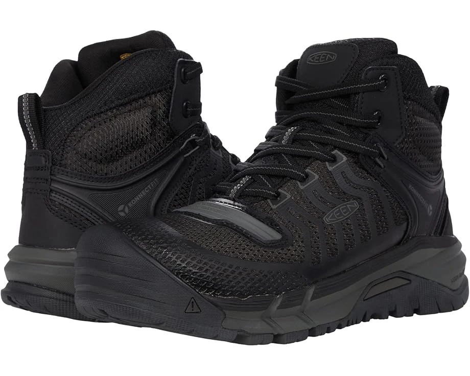 Get the job done right in the KEEN® Kansas City Mid KBF. These safety shoes are constructed with a lace-up closure, composite safety toe, pull tab at the back, moisture-wicking lining to help keep your feet dry and a slip resistant rubber sole for traction and ultimate versatility.SKU: #9550117Left and right asymmetrical, non-metallic carbon-fiber composite safety toe meets ASTM F2412-18 and F2413-18 F I/75 C/75 EH standards and offers unobtrusive fit and are 15% lighter than steel.Removable footbed.KEEN.DRY waterproof, breathable membrane releases vapor from the interior without letting moisture in, creating a drier, more breathable foot environment. Slip-resistant outsole meets ASTM F1677-96 MARK II and ASTM F2913-17 SATRA Non-Slip Testing Standards.