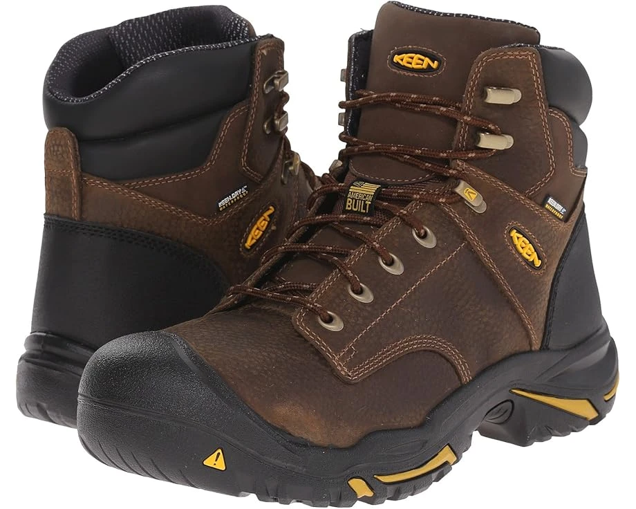 The MT Vernon Mid Soft Toe work boot from KEEN Utility™ makes sure you get the job done right with its ideal combination of tough leather construction, supportive underfoot comfort, and slip-resistant outsole. SKU: #8642320Waterproof nubuck leather upper.Locking metal hook and lacing eyelets.KEEN.DRY waterproof breathable membrane locks out rain and humidity, but releases the heat and perspiration created throughout a hard day’s work.Dry-Lex footwear lining with hydrophobic/hydrophilic 2-zone comfort technology.Removable metatomical dual-density EVA footbed with integrated PU heel cushion provides comfortable support.Metatomical footbed design is an internal support mechanism that’s anatomically engineered to provide excellent arch support while cradling the natural contours of the foot.Direct attach PU midsole for added durability and underfoot support.Oil and slip-resistant non-marking rubber outsole meets or exceeds ASTM F1677-96 Mark II non-slip testing standards.Soft toe meets or exceeds ASTM F2892-11 EH Standards for electrical hazard protection from open circuits.Imported.Product measurements were taken using size 12, width EE – Wide. Please note that measurements may vary by size.Measurements: