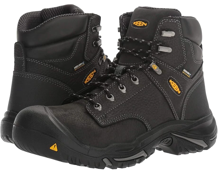 The Keen Utility™ MT Vernon Mid steel toe work boot makes sure you get the job done right with its tough leather construction, safety toe protection, supportive underfoot comfort, and slip-resistant outsole. SKU: #8570326Waterproof nubuck leather upper.Locking metal hook and lacing eyelets.Keen.Dry waterproof breathable membrane locks out rain and humidity, but releases the heat and perspiration created throughout a hard day’s work.Dry-Lex footwear lining with hydrophobic/hydrophilic 2-zone comfort technology.Removable metatomical dual-density EVA footbed with integrated PU heel cushion provides comfortable support.Metatomical footbed design is an internal support mechanism that’s anatomically engineered to provide excellent arch support while cradling the natural contours of the foot.Direct attach PU midsole for added durability and underfoot support.Oil and slip-resistant non-marking rubber outsole meets or exceeds ASTM F1677-96 Mark II non-slip testing standards.Steel toe meets or exceeds ASTM F2412-11 and F2413-11 I/75 C/75 EH standards for electrical hazard protection from open circuits.Made in the U.S.A. with imported materials. Product measurements were taken using size 11, width EE – Wide. Please note that measurements may vary by size.Measurements: